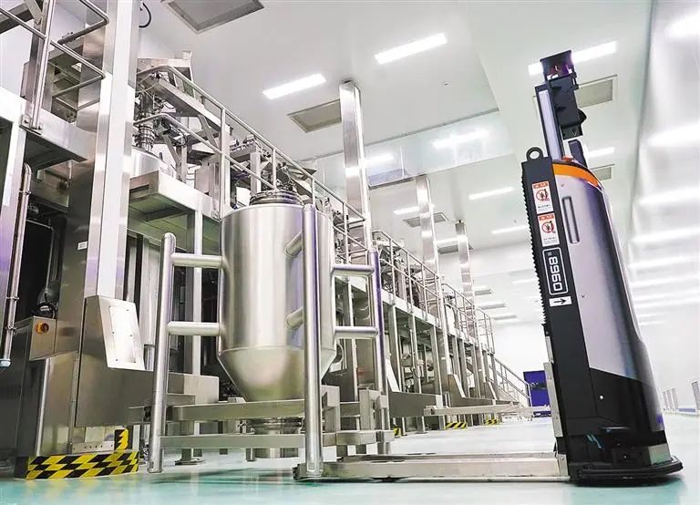 11月28日,武汉禾元生物植物源重组人血清白蛋白洁净化黑灯工厂内,AGV机器人正在工作