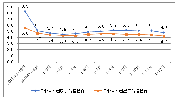 工业品进出厂价格“剪刀差”缩小。随着上游原材料价格逐渐回落,工业品价格指数涨势放缓,2018年,我省出厂价格比上年平均上涨4.2%,涨幅同比回落1.4个百分点;购进价格比上年平均上涨4.8%,涨幅回落3.5个百分点,全省工业品购进与出厂价格“剪刀差”由去年同期的2.7个百分点缩小至0.6个百分点,其中,12月当月出厂价格同比上涨2.1%,购进价格同比上涨1.9%,进出价格“剪刀差”由11月份的0.7个百分点转为-0.2个百分点,成为利润大幅增长的主要因素。