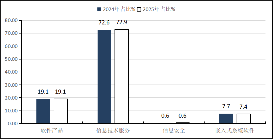 信息技术服务收入3007.72亿元,同比增长16.8%,在全行业收入中占比为72.9%;信息安全收入23.41亿元,同比增长12.7%;嵌入式系统软件收入306.40亿元,同比增长12.5%。