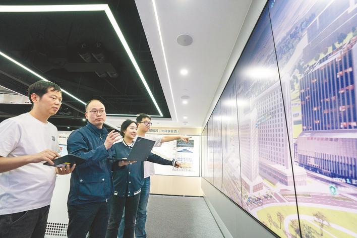 北京大学武汉人工智能研究院,研发工程师在讨论完善大型社会模拟器。该项目基于多层级智能体系,能够模拟预测社会系统的运行,支撑重大社会决策。