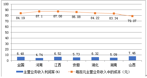 图3 1-11月全国及中部六省利润率与每百元主营业务收入中的成本