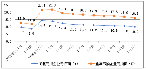 (二)企业亏损额由降转升。1-11月,全省规上企业中有1567家出现亏损,亏损企业亏损额173亿元,增长4.4%,同比、环比分别扩大9.1、9.3个百分点。从不同所有制企业看,国有控股企业亏损额90亿元,增长4.8%,同比、环比分别扩大14.4、24.9个百分点;从企业类型看,小型企业亏损额75.5亿元,增长42.1%,同比、环比分别扩大40.1、28.2个百分点;从市(州)看,武汉、黄石、十堰、襄阳、荆州亏损企业亏损额分别增长48.6%、45.8%、138.2%、69.8%、46.7%。