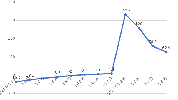 一是生产延续稳定恢复态势。1—5月,全省规上工业增加值同比增长45.9%,高于全国平均水平(17.8%)28.1个百分点,较2019年同期增长7.7%,两年平均增长3.8%。5月当月增长3.0%,环比回落7.1个百分点,低于全国(8.8%)5.8个百分点。1—5月,41个大类行业中有40个行业保持同比正增长(其他采矿业-12.4%),33个行业增速超过30%,20个行业增速超过50%。