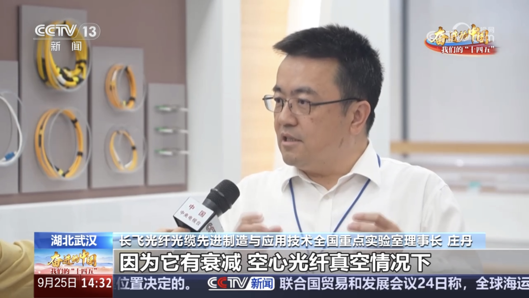 长飞光纤光缆先进制造与应用技术全国重点实验室理事长 庄丹:过去实心的石英光纤,传输速度是每秒20万公里,因为有衰减。空心光纤真空的情况下,几乎没有衰减,传输速度接近每秒30万公里,传输速度提高,时延降低30%以上,达到世界领先水平。打破国外垄断,把核心技术牢牢地掌握在自己手里,不被别人卡脖子。