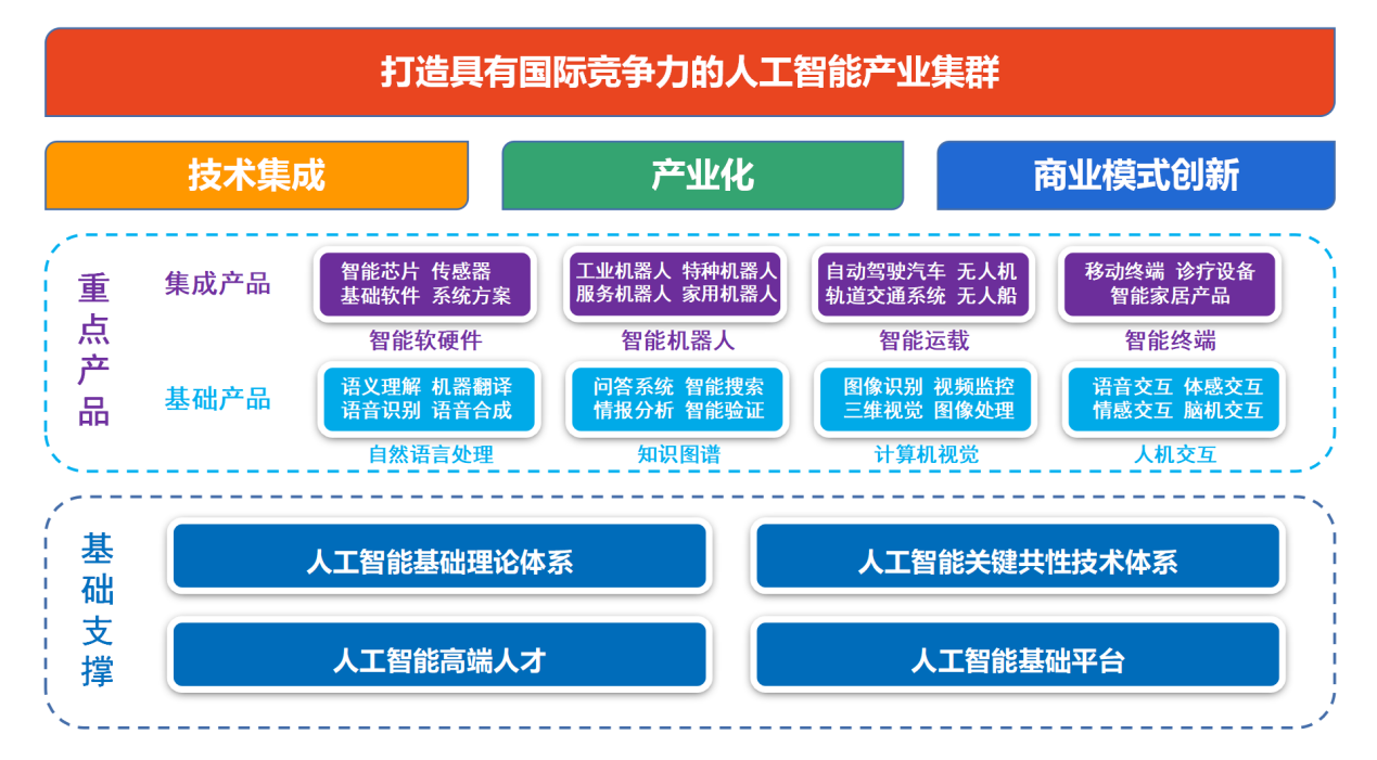 加快人工智能关键技术研发及产业化,促进技术集成与商业模式创新,推动重点领域智能产品创新,积极培育人工智能新兴业态,推动产业高端发展,打造具有国际竞争力的人工智能产业集群。