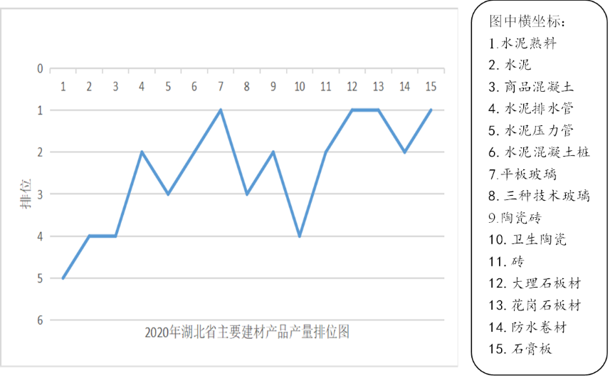 图2 2020年湖北省主要建材产品产量排位图(中部六省)