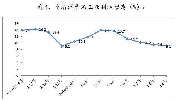 消费品工业效益持续回落。1-9月,消费品工业实现主营收入10455.6亿元,增长8.5%,环比下降0.6个百分点;实现利润552.5亿元,增长9.1%,环比回落0.5个百分点,连续5个月出现回落。食品烟草行业实现主营业务收入5862.5亿元,同比增长8.1%;实现利润323.5亿元,增长7.2%,同比回落8.6个百分点。其中食品制造业增长较快,实现利润50亿元,同比增长17.8%;烟草利润70.7亿元,增长6.7%,环比回升4.5个百分点。纺织行业实现主营业务收入2367.2亿元,增长8%;实现利润95.7亿元,增长7.9%,同比回落1.7个百分点。医药行业保持较快增长,实现主营业务收入843亿元,增长13%;实现利润68.2亿元,增长24.1%,同比加快14.9个百分点。