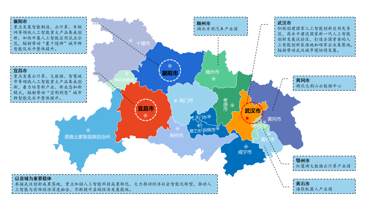 支持襄阳、宜昌提升省域副中心城市能级,以“襄十随神”城市群和“宜荆荆恩”城市群为重点,充分利用襄阳装备工业优势以及宜昌在大数据、旅游、生物医药等领域的基础,推动人工智能重大产品集成创新,加快布局人工智能创新应用试点示范,着力培育新产业、新业态和新模式,打造差异化、特色化的人工智能应用服务体系,带动城市群智能化水平整体提升。
